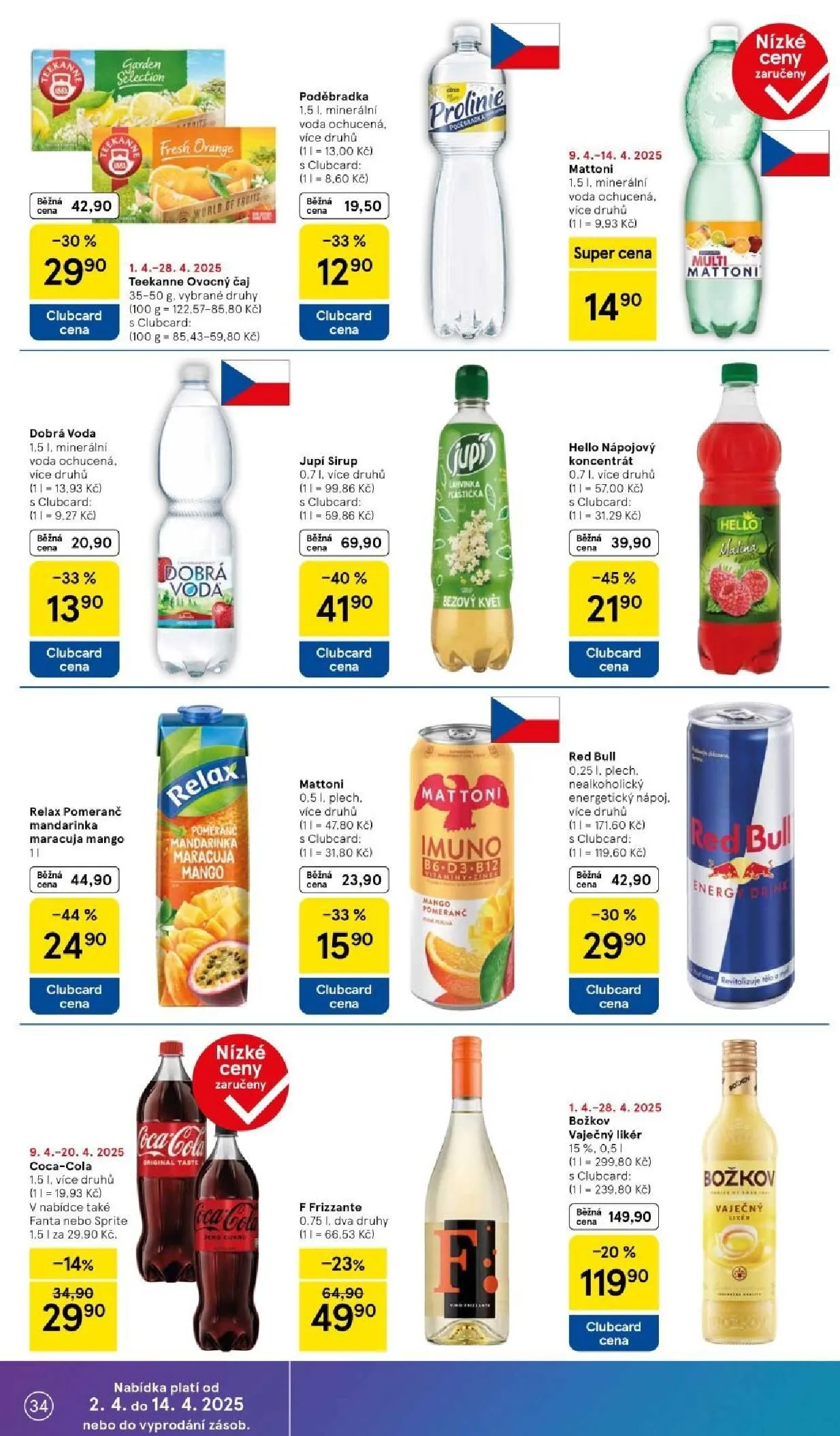 V letáku obchodu Tesco najdete širokou nabídku produktů za skvělé ceny. Například minerální voda ochucená Dobrá voda je nyní za 42,90 Kč s 30% slevou. Relax pomeranč-mandarinka a maracuja-mango jsou k dispozici za 20,90 Kč, což představuje 33% slevu. Coca-Cola 1,5 l a další nápoje jako Fanta nebo Sprite jsou v akci za 29,90 Kč.