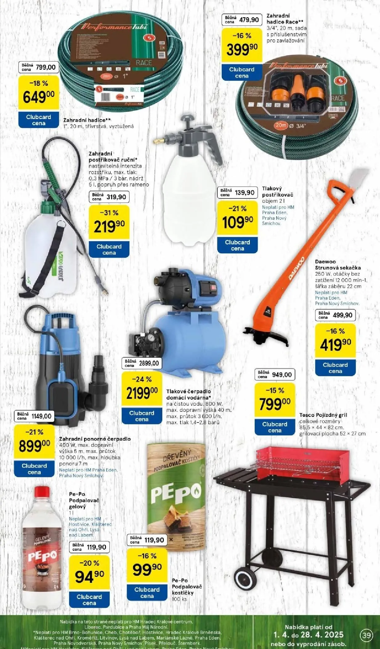 V letáku obchodu Tesco najdete širokou nabídku produktů se skvělými slevami. Například zahradní hadice o délce 20 m je nyní za cenu 319,90 Kč, což představuje slevu 31 %. Pro milovníky grilování je k dispozici pojízdný gril za 419,90 Kč, se slevou 16 %. Pokud potřebujete zahradní čerpadlo, máme pro vás ponorné čerpadlo s maximálním průtokem 10 000 l/h za 999,90 Kč, což je sleva 20 %. Nezapomeňte také na strunovou sekačku Daewoo za 499,90 Kč, se slevou 16 %. Všechny ceny platí při použití Clubcard. Nabídka je platná od 1. do 28. dubna 2025 nebo do vyprodání zásob.