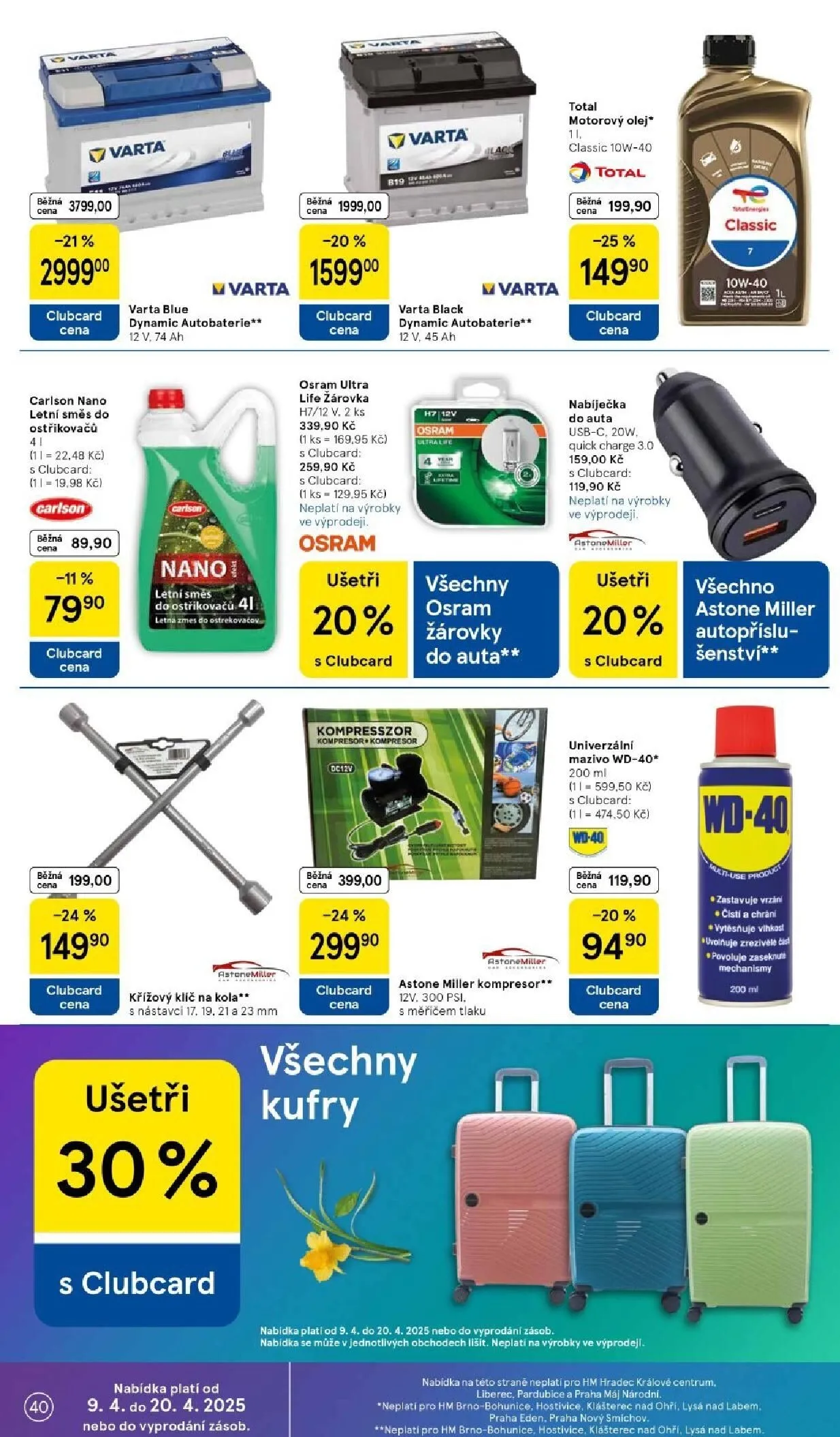Osram Ultra Life žárovky můžete zakoupit za 259,90 Kč s Clubcard, což je výrazná úspora. Motorový olej Total Classic Low-40 je nyní za 149,90 Kč, a nabíječka do auta s USB-C a Quick Charge 3.0 je k dostání za 119,90 Kč s Clubcard.