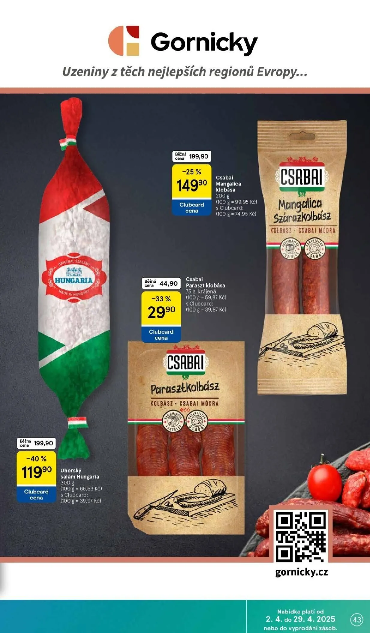 V letáku obchodu Tesco najdete širokou nabídku kvalitních uzenin z nejlepších regionů Evropy. Například, klobása Csabai o hmotnosti 200 g je nyní za cenu 149,90 Kč, což je sleva 25 % pro držitele Clubcard. Další zajímavou nabídkou je krájená klobása Parasit, která je k dostání za 29,90 Kč s Clubcard. Nezapomeňte také na salám Hungaria o hmotnosti 300 g, který můžete pořídit za 119,90 Kč, což představuje slevu 40 %. Akce platí od 2. 4. do 29. 4. 2025 nebo do vyprodání zásob.