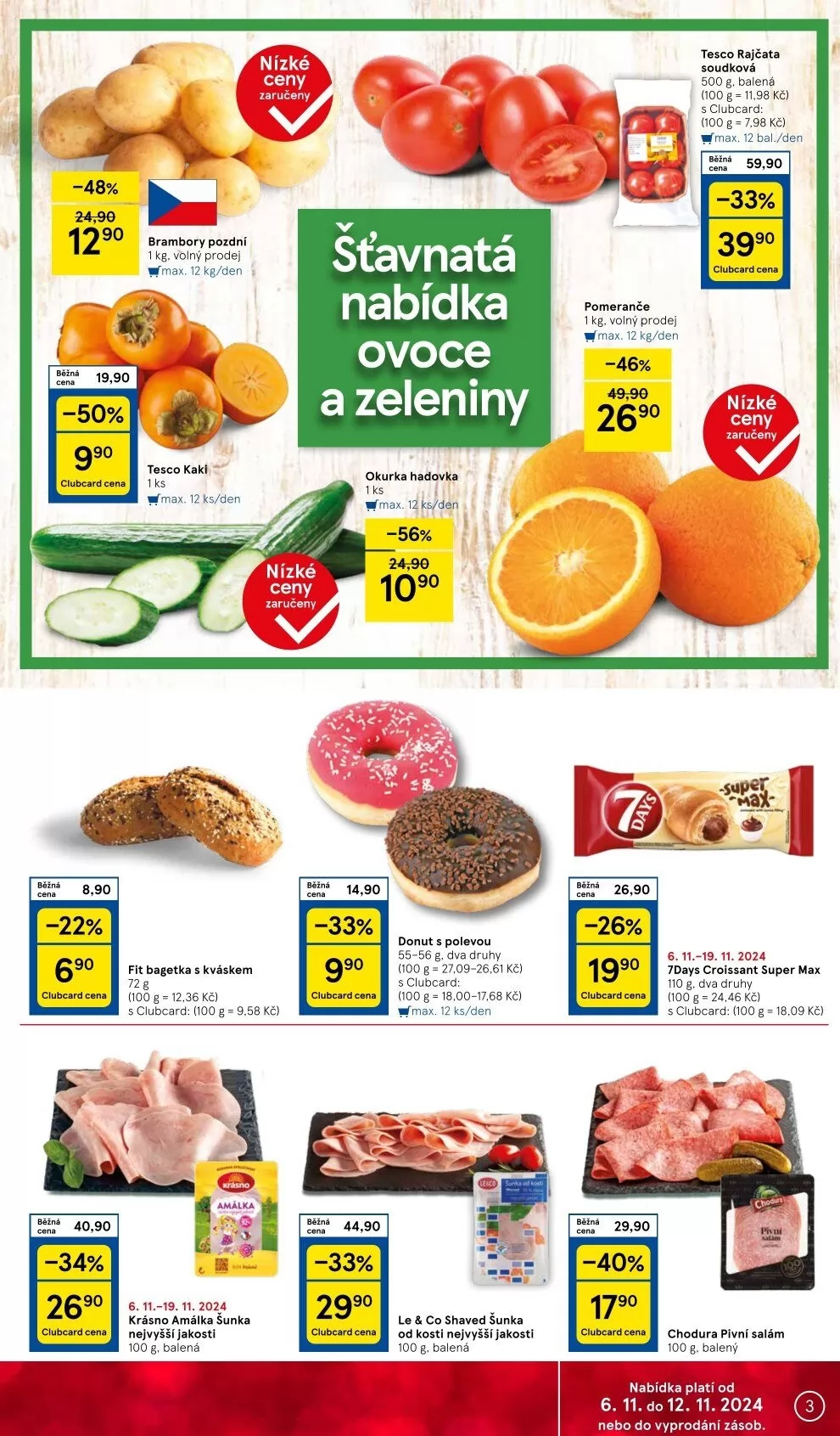 V letáku obchodu Tesco najdete skvělé nabídky na ovoce, zeleninu a uzeniny. Brambory pozdní jsou nyní za 19,90 Kč za 1 kg, s maximálním prodejem 12 kg denně. Šťavnaté pomeranče jsou k dostání za 26,90 Kč za 1 kg, a okurka hadovka za 10,90 Kč.