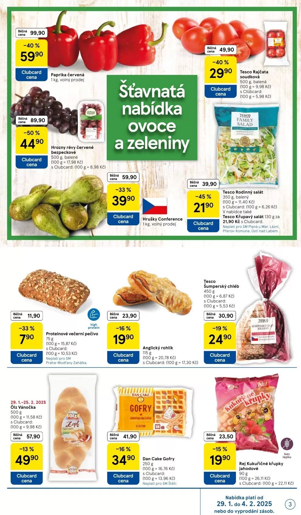 V nabídce najdete i sladké pochoutky, jako jsou Dan Cake gofry 250 g za 41,90 Kč. Akce platí od 29. 1. do 4. 2. 2025 nebo do vyprodání zásob. Nezapomeňte využít Clubcard pro ještě výhodnější ceny!