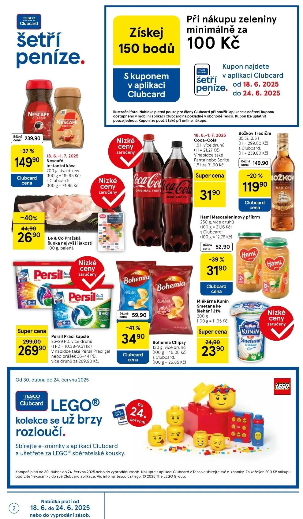V letáku obchodu Tesco najdete skvělé nabídky a slevy pro členy Clubcard. Získejte 150 bodů s kuponem v aplikaci Clubcard při nákupu zeleniny nad 100 Kč. Mezi akčními produkty je například instantní káva Nescafé, která je nyní za výhodnou cenu 74,95 Kč za 100 g.