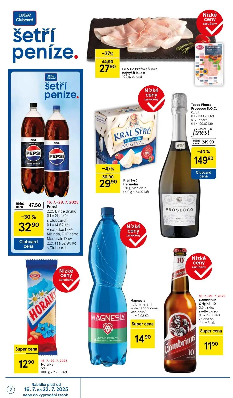 Dalšími lákadly jsou hermelín Král sýrů za 24,92 Kč/100 g a minerální voda Magnesia 1,5 l za výhodnou cenu. Nezapomeňte také na prosecco Tesco Finest, které je nyní za 199,87 Kč s Clubcard.