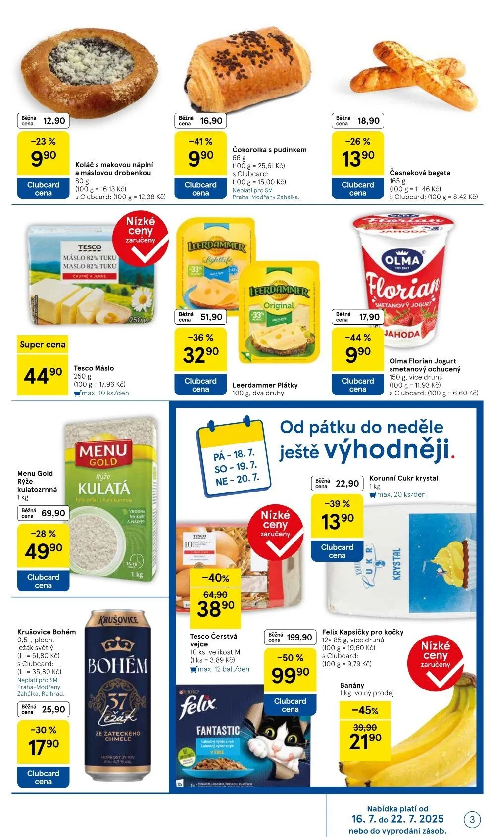 Nezapomeňte také na Tesco čerstvá vejce (10 ks, velikost M) za 38,90 Kč a Felix kapsičky pro kočky (12 x 85 g) za 199,90 Kč.