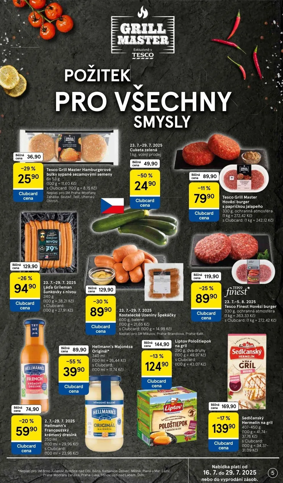 V letáku obchodu Tesco najdete skvělou nabídku produktů pro grilování, které potěší všechny vaše smysly. Mezi hlavními lákadly jsou hamburgerové bulky s sezamovými semeny za 36,90 Kč, šunkovky s nivou za 129,90 Kč a špekáčky od Kosteleckých uzenin za 49,90 Kč.