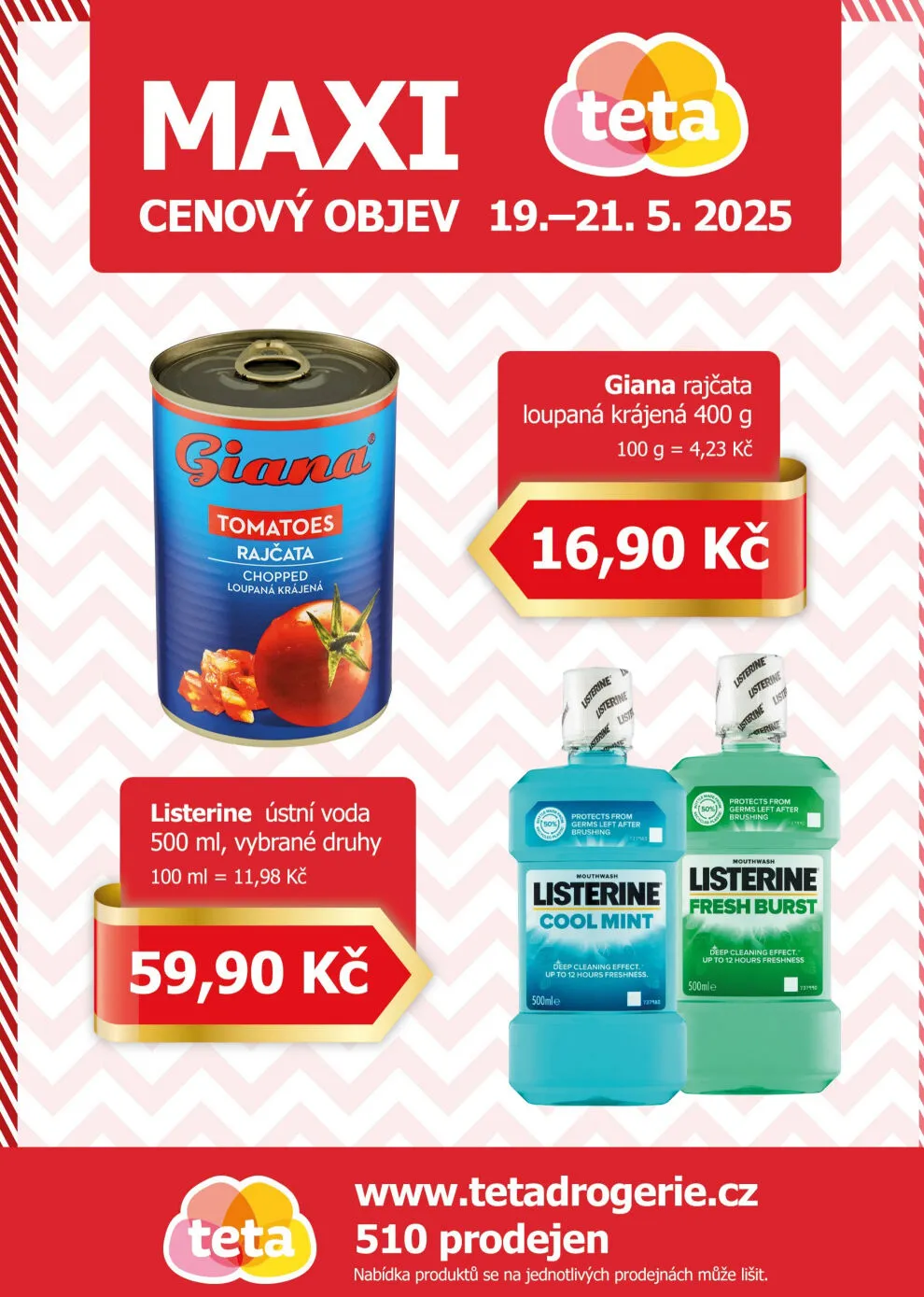 V letáku obchodu Teta drogerie najdete skvělé cenové objevy! Mezi nimi se objevují loupaná krájená rajčata značky Giana v balení 400 g za pouhých 16,90 Kč, což představuje cenu 100 g = 4,23 Kč. Dále si můžete pořídit ústní vodu Listerine v objemu 500 ml, vybrané druhy, za cenu 59,90 Kč (100 ml = 11,98 Kč). Nezapomeňte, že akce platí od 19. do 21. května 2025. Navštivte www.tetadrogerie.cz a objevte širokou nabídku produktů ve více než 510 prodejnách, kde se sortiment může lišit.