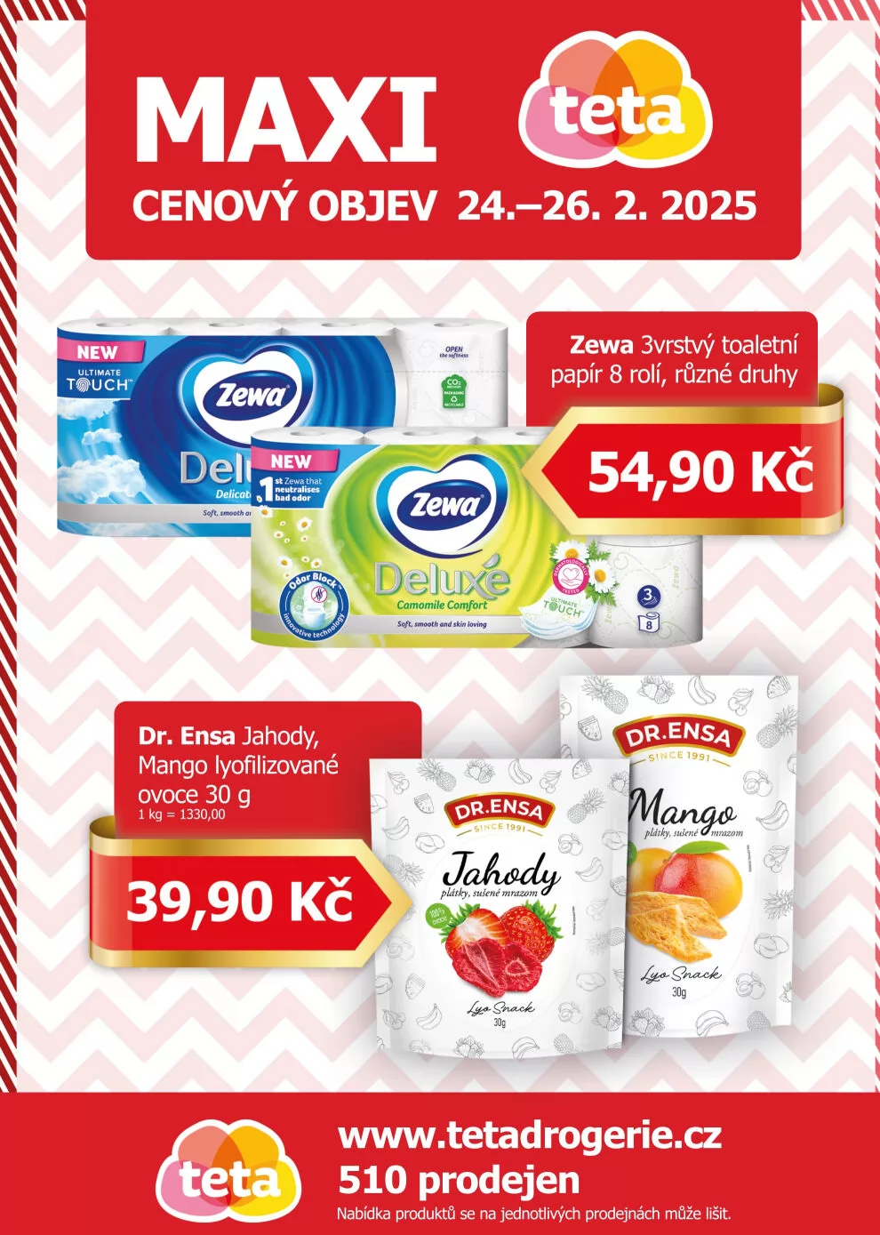 V letáku obchodu Teta drogerie najdete skvělé cenové objevy od 24. do 26. února 2025. Mezi nabízenými produkty se objevují lyofilizované ovoce, jako jsou jahody a mango, v balení 30 g za cenu 39,90 Kč (1 kg = 1330,00 Kč). Dále si můžete pořídit 3vrstvý toaletní papír Zewa v balení 8 rolí, který je k dispozici za 54,90 Kč. Nezapomeňte, že nabídka produktů se může na jednotlivých prodejnách lišit. Navštivte naše stránky www.tetadrogerie.cz pro více informací.