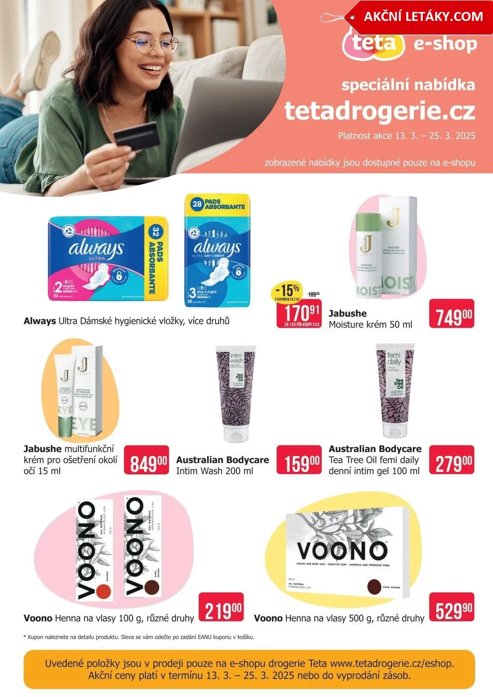 Využijte speciální nabídku na e-shopu Teta drogerie od 13. 3. do 25. 3. 2025! Objevte širokou škálu produktů, které jsou dostupné pouze online.