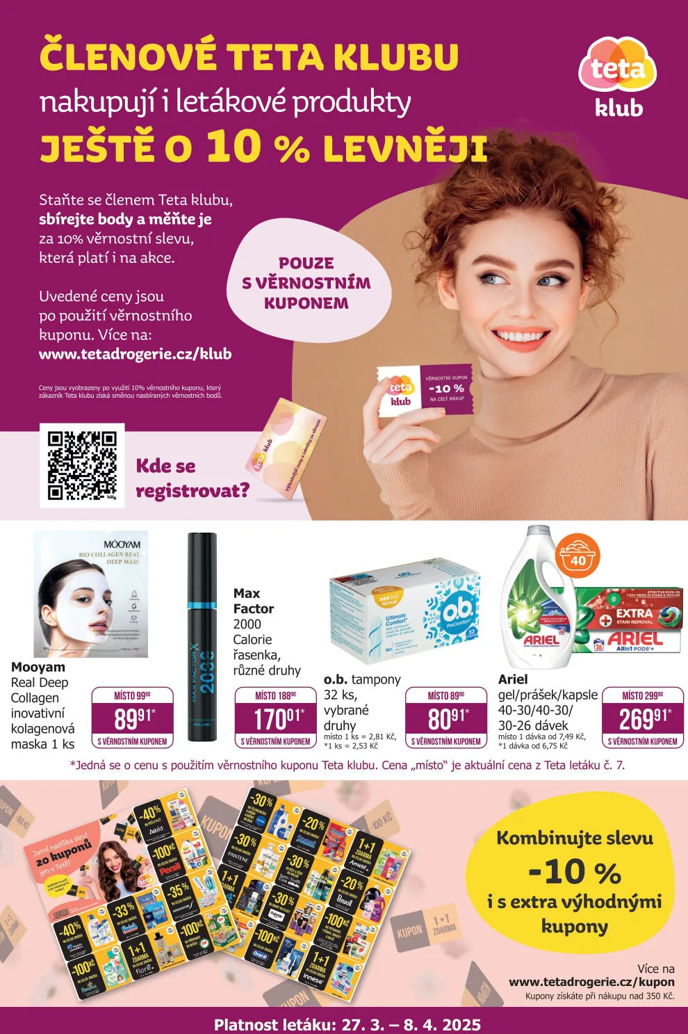 V letáku obchodu Teta drogerie najdete širokou nabídku produktů za výhodné ceny. Členové Teta klubu mohou nakupovat letákové produkty ještě levněji díky věrnostní slevě 10 %, kterou získají sbíráním bodů. Například inovativní kolagenová maska Real Deep Collagen, řasenka Max Factor 2000 Calorie a tampony o.b. jsou nyní k dispozici se slevou. Extra výhodné nabídky zahrnují Ariel gel, prášek a kapsle, které můžete pořídit za skvělé ceny s použitím věrnostního kuponu. Nezapomeňte, že kupony získáte při nákupu nad 350 Kč. Pro více informací navštivte www.tetadrogerie.cz/klub a www.tetadrogerie.cz/kupon. Platnost letáku je do 27. 3. 2025.