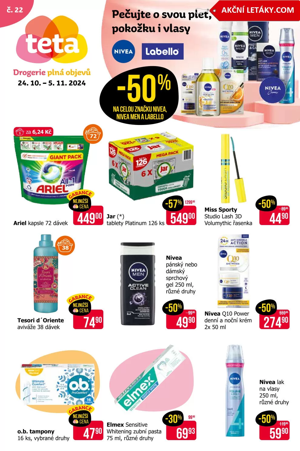 V letáku obchodu Teta drogerie, platném od 24. 10. do 5. 11. 2024, najdete širokou nabídku produktů za skvělé ceny. Mezi hlavními nabídkami se objevují Ariel kapsle na 72 dávek za 449 Kč, Nivea sprchové gely pro muže i ženy v různých druzích, a to za 99 Kč. Nezapomeňte také na Nivea Q10 Power denní a noční krém v balení 2x 50 ml za 749 Kč. Pro péči o zuby je k dispozici Elmex Sensitive Whitening zubní pasta 75 ml.