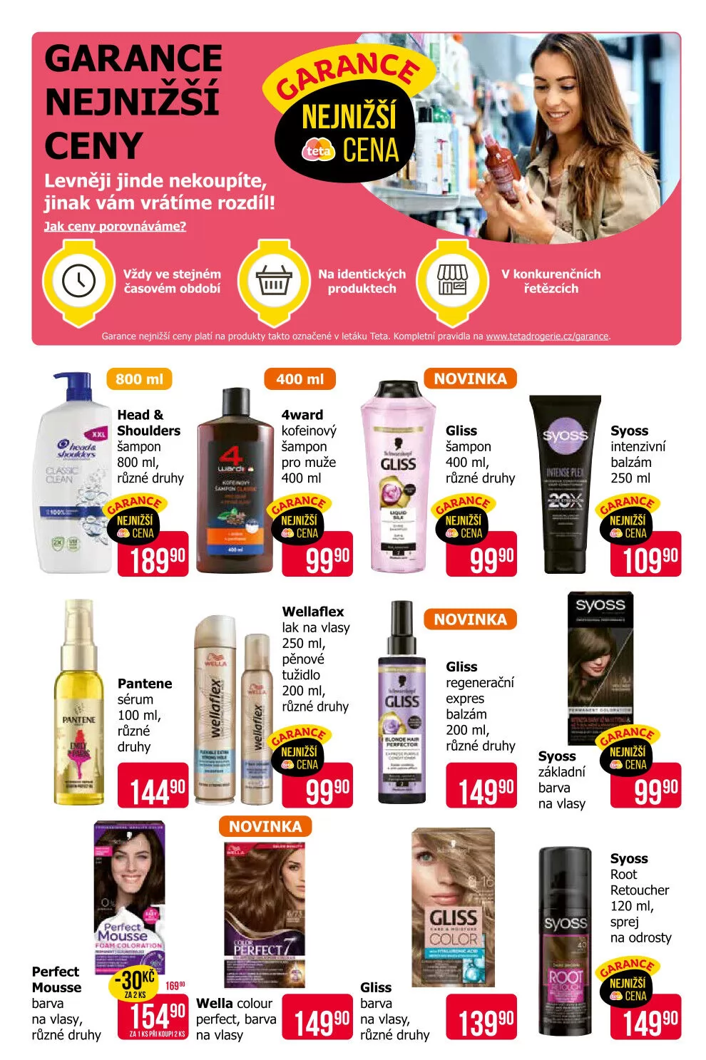 V letáku obchodu Teta drogerie najdete širokou nabídku kvalitních produktů za nejnižší ceny. Pokud objevíte stejný produkt levněji jinde, vrátíme vám rozdíl! Mezi nabízenými produkty se nachází šampon Head & Shoulders 800 ml, různé druhy, a Pantene sérum 100 ml. Dále můžete zakoupit Wellaflex lak na vlasy 250 ml a pěnové tužidlo 200 ml.