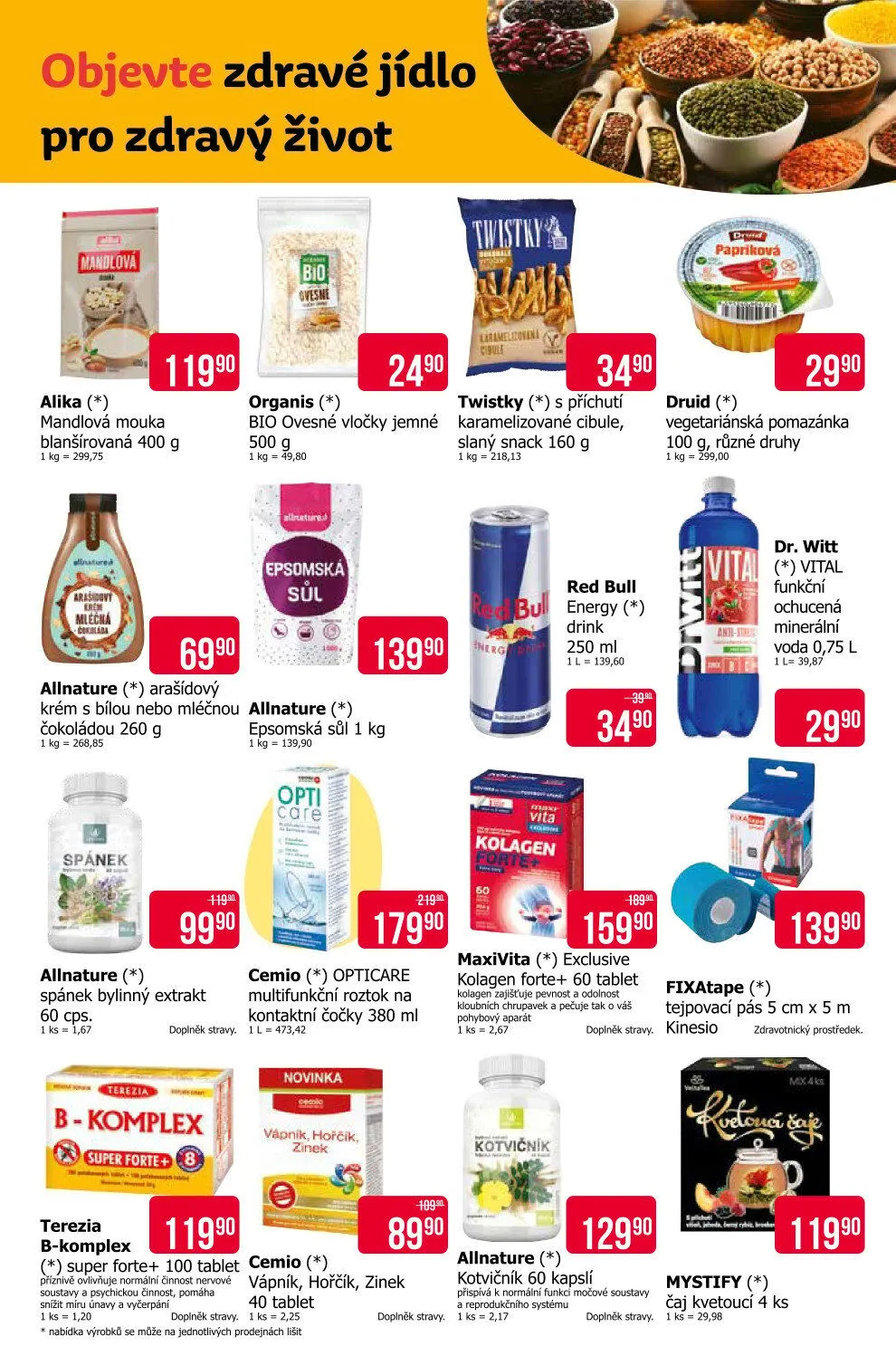 Dále nabízíme doplňky stravy, jako je kolagen forte+, zinek a kotvičník, které přispívají k normální funkci organismu. Nezapomeňte také na chutné vegetariánské pomazánky a osvěžující ochucené minerální vody.