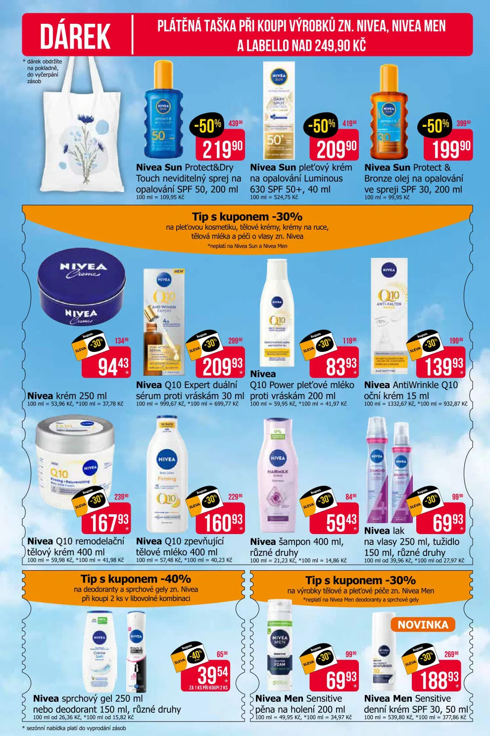 V letáku obchodu Teta drogerie najdete širokou nabídku produktů značky Nivea. Při nákupu výrobků Nivea, Nivea Men a Labello nad 249,90 Kč obdržíte plátěnou tašku jako dárek. Mezi nabízenými produkty jsou pleťové krémy, opalovací přípravky, šampony a tělové mléka. Například Nivea Sun Protect & Dry pleťový krém s SPF 50 a Nivea Q10 Expert duální sérum proti vráskám.