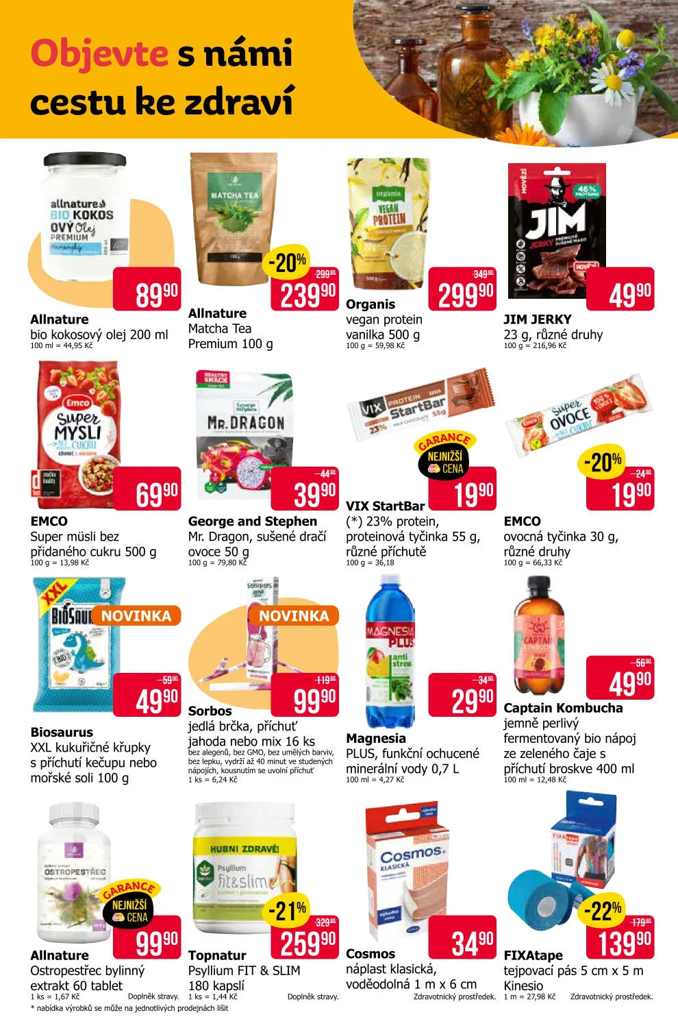 Nezapomeňte na funkční ochucené minerální vody Magnesia Plus 0,7 l za 29,90 Kč a jemně perlivý fermentovaný bio nápoj Captain Kombucha 400 ml za 49,90 Kč.