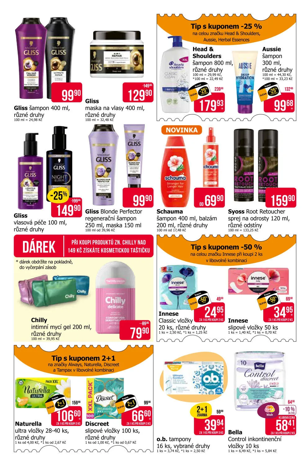Dále si můžete vybrat z nabídky intimních mycích gelů Chilly a vložek Always, Naturella a Discreet s akcí 2+1.