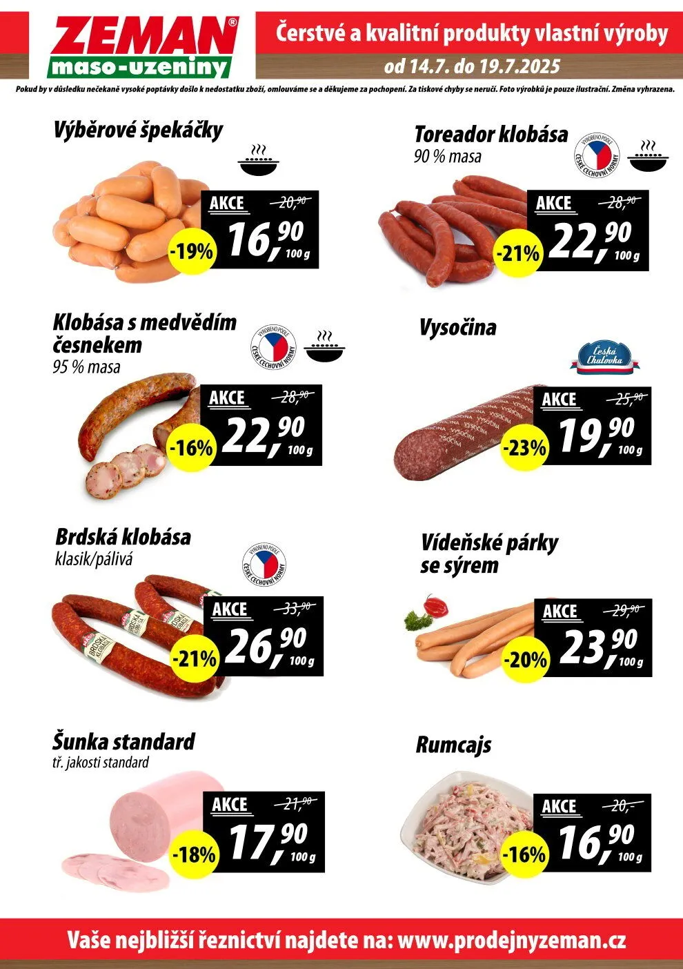 Dalšími lákadly jsou vídeňské párky se sýrem za 23,90 Kč/100g a šunka standard tř. jakosti s 18% slevou. Nezapomeňte, že v případě vysoké poptávky může dojít k nedostatku zboží. Pro více informací navštivte naše stránky na www.prodejnyzeman.cz.