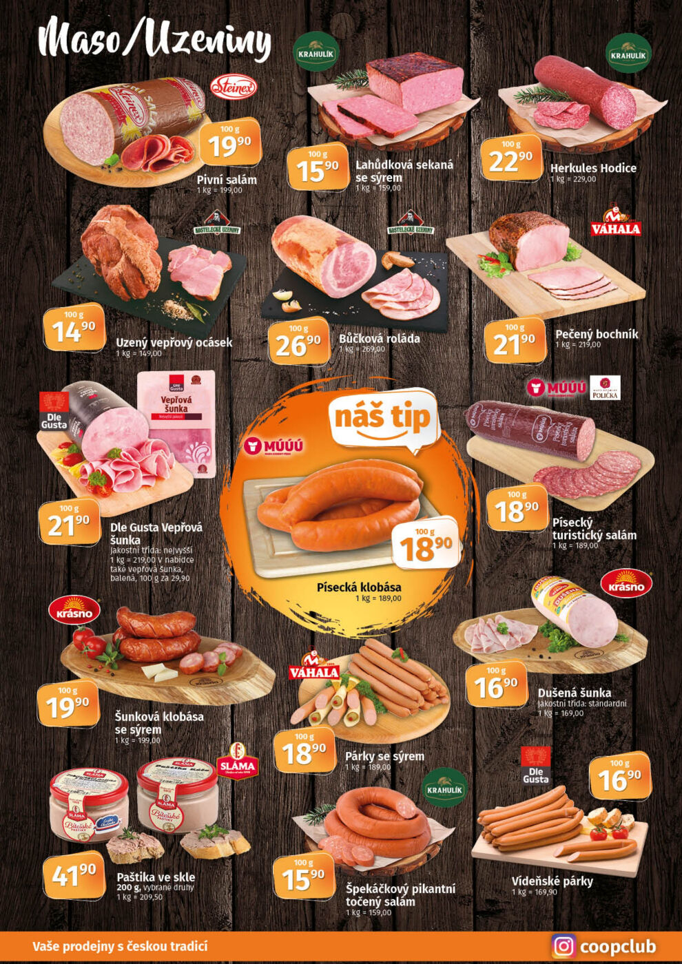 Salám špekáčkový pikantní točený Krahulík akční sleva v Coopu (30.7. do 12.8. 2025)